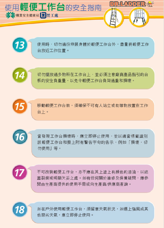 為提升高處工作的安全水平,本公司所提供合符職安健安全標準的輕便工作台,除了已經在梯身貼上安全規格標籤外,全以一梯一證書方式發售,給香港各界的中小型企業申請及購買使用。